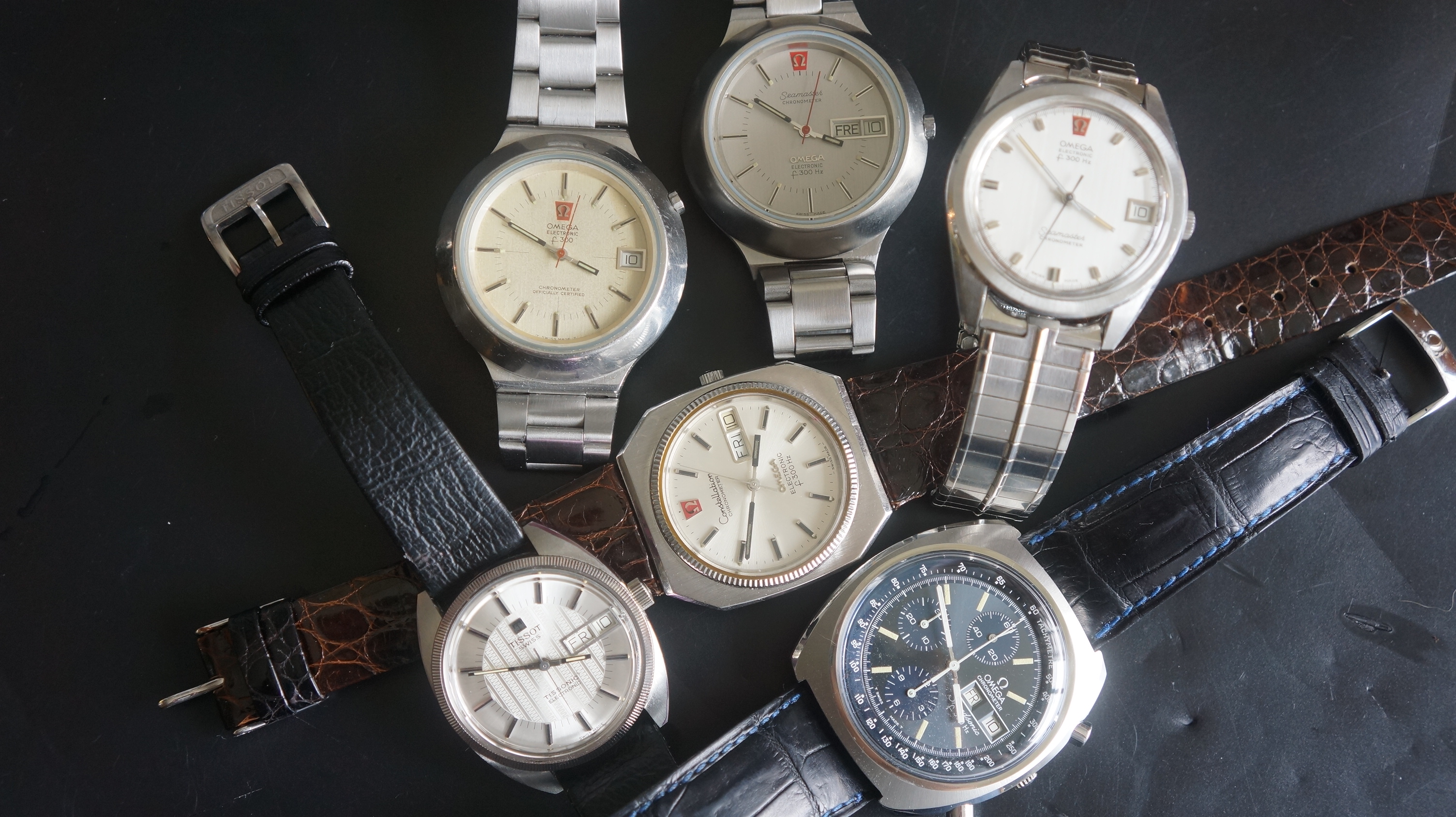 This is my collection of different F300 . Like to add a blue or dark dial seamaster chronometer or something to the collection someday . A dark horse has nestle it's way in to the pack .